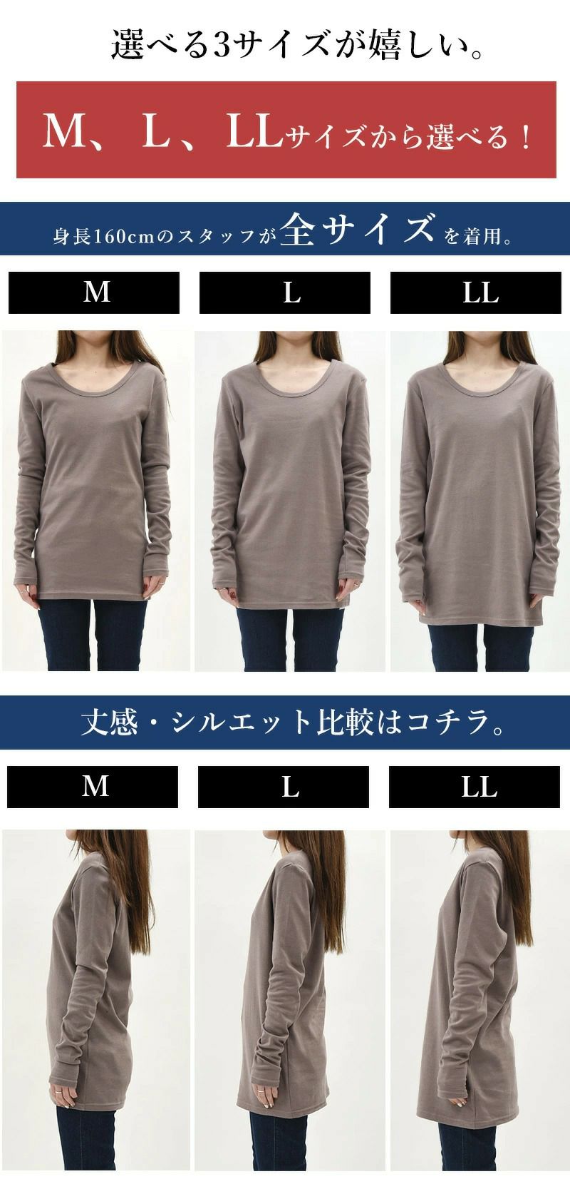 [Lサイズ]キレイなラインに見せてくれるロング丈が嬉しい♪袖や裾にややフィット感がありましたが、伸縮性のある生地なので締め付け感はありませんでした。 [LLサイズ]おしり下まで覆ってくれる丈感と、裾幅や袖幅にもゆとりをもって着られるので安心のサイズ感です。ベーシックなアイテムなので自分好みのサイズとカラーから選べるのが嬉しいですね!