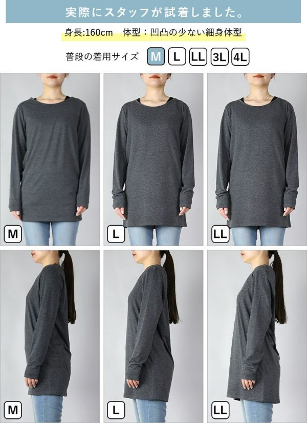 160cm71kg、Lサイズを愛用しています。 肌触りが良いので、私はパーカーやニットのインナーとして使うことが多いです。 カラーバリエーションが豊富なので、今度は1枚で着るためにキレイ色を買い足したいと思います。