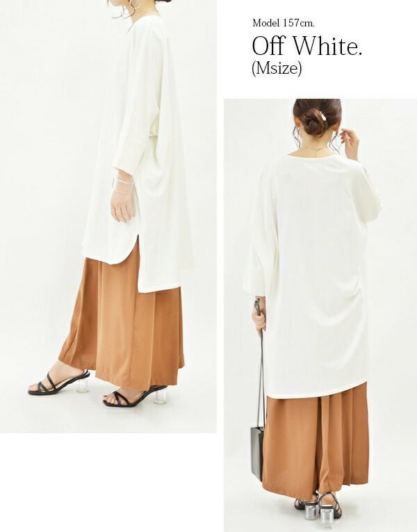 ゆったとしているので[M-L]サイズを着用。着丈は膝から10cmくらい上で、袖丈は手首から10cmくらいでした。アームホール周りもゆとりがあるので腕も動かしやすく、締め付け感がなかったです◎ゆるっとした着こなしを楽しめますね☆