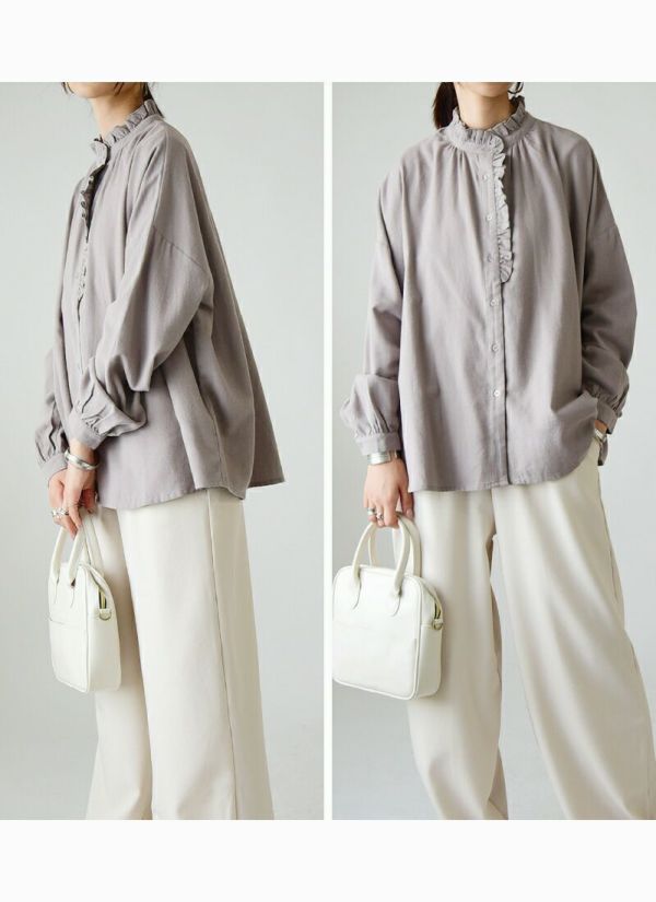 フリルデザインで女性らしい雰囲気に♪ほっこり起毛生地が秋冬感漂う着回しブラウス。