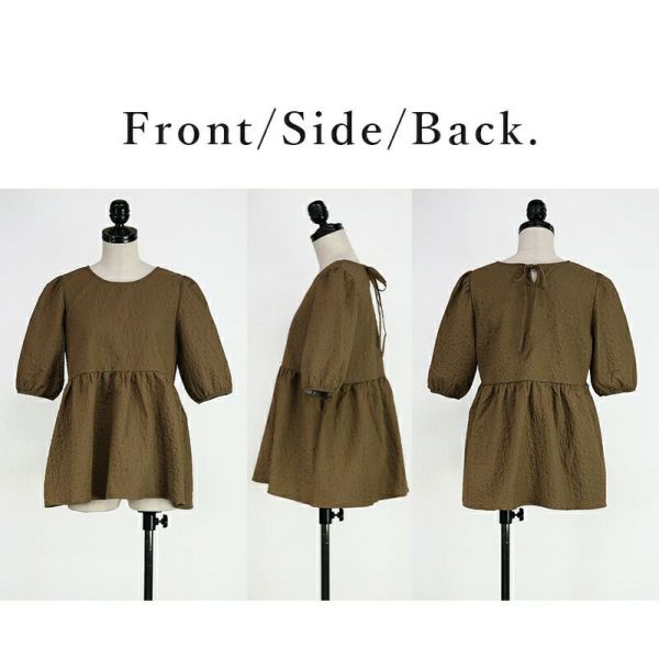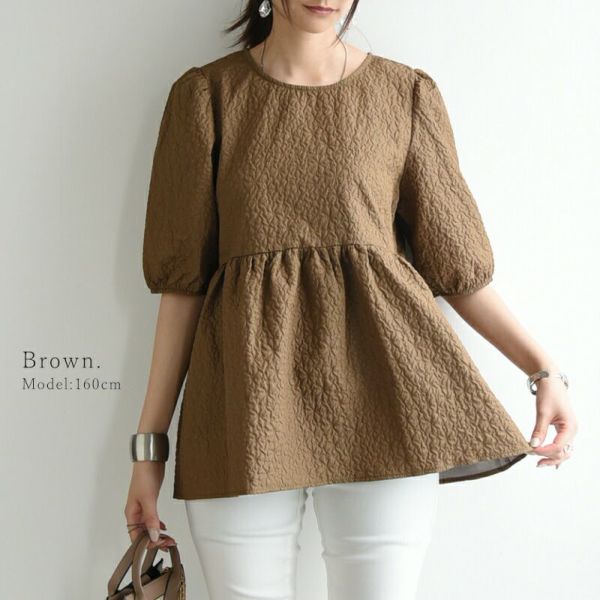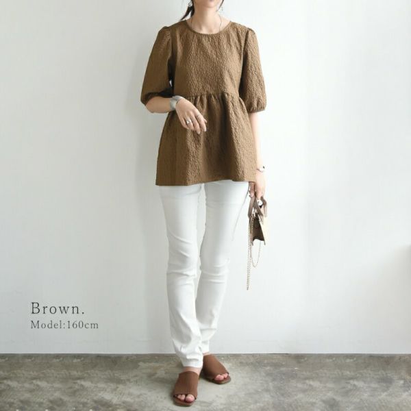 トップス ブラウス レディース 春 夏 ふくれ ジャガード パフスリーブ ボリュームスリーブ 半袖 五分袖 二の腕カバー 凹凸 立体感 ハリ感 ペプラム ふんわり バックリボン ホワイト ブラック スカイブルー ブラウン 黒 白 M L andit_ and it_ andit ANDIT_ ANDIT あんどいっと アンドイット SS 新作 NEW カジュアル ナチュラル きれいめ 大人可愛い 大人女子 お洒落 トレンド シンプル ニュアンス ゆったり 楽ちん ラフ 体型カバー ぽっちゃり プチプラ ファッション レディースファッション ママ服 20 30 40 50 20代 30代 40代 50代