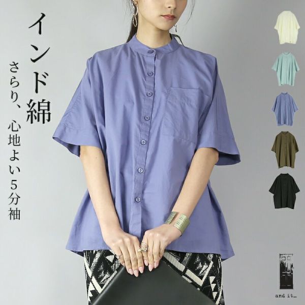 シャツ レディース インド キャンブリック 5分袖 トップス 半袖 インド綿 インドコットン 涼感 涼しい 軽やか 透け感 二の腕カバー バンドカラー シンプル カジュアル ブラック オフホワイト ヒヤシンス ミントグリーン ブラウン NEW ニュー カジュアル かじゅある ナチュラル なちゅらる 女性 綺麗 綺麗目 綺麗め きれいめ キレイメ キレイめ きれい キレイ 可愛い かわいい カワイイ カッコいい かっこいい 格好良い カッコイイ 大人 オトナ おとな オトナカワイイ おとなかわいい 大人可愛い 大人女子 おとなじょし オトナジョシ お洒落 おしゃれ オシャレ トレンド 旬 とれんど 流行 こなれ感 こなれ 高見え 上質 上品 シンプル ニュアンス ラクチン らくちん 楽ちん 楽 動きやすい ゆったり ゆる ゆったりサイズ ゆるカジ ゆるい ゆるファッション 体型カバー プラスサイズ 大きいサイズ ビッグ ビック big ビックシルエット ビッグシルエット ビックサイズ ビッグサイズ オーバーサイズ オーバー フリーサイズ フリー S M L LL 2L XL 3L XXL LLL 着痩せ 着回し 華奢見せ 華奢見え ベーシック プチプラ ファッション レディースファッション レディファ カジュアルコーデ 大人コーデ オトナコーデ 大人カジュアルコーデ きれいめコーデ きれいめカジュアルコーデ オフィスカジュアルコーデ オフィスカジュアル オフィス テレワーク リモートワーク リモート オンライン飲み会 飲み会 打ち上げ ご飯会 ランチ おうち時間 お家時間 デート お出かけ フェス リゾート ビーチ 海 旅行 飛行機 パーティー パーティ 韓国ファッション 韓国コーデ 韓国風 韓国 母の日 母のひ プレゼント ギフト 贈り物 クリスマス 誕生日 春 夏 秋 冬 春夏 秋冬 andit_ and it_ andit ANDIT_ ANDIT あんどいっと アンドイット 20 30 40 50 60 20代 30代 40代 50代 60代