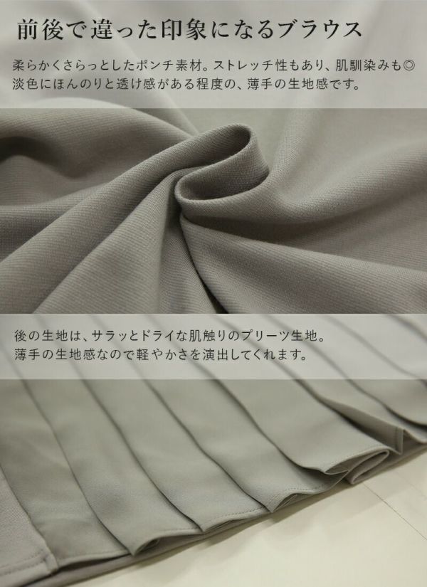 異素材プリーツで後ろ姿も上品な印象に。ふんわり軽やか、女性らしさをプラス。