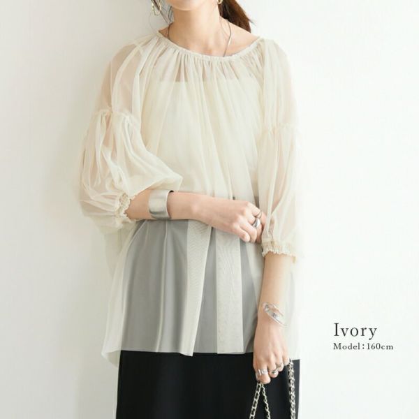 トップス ブラウス レディース チュール レイヤード ギャザー シアー 透け感 涼感 トレンド 重ね着 レイヤード 七分袖 7分袖 ふんわり ボリューム スリーブ ボリューム袖 アイボリー ブラック 白 黒 M Mサイズ 春 夏 春服 夏服 andit_ and it_ andit ANDIT_ ANDIT あんどいっと アンドイット SS 新作 NEW カジュアル ナチュラル きれいめ 大人可愛い 大人女子 お洒落 トレンド シンプル ニュアンス ゆったり 楽ちん ラフ 体型カバー ぽっちゃり プチプラ ファッション レディースファッション ママ服 20 30 40 50 20代 30代 40代 50代