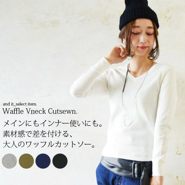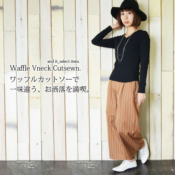 カジュアルなワッフルカットソーもVネックで女性らしさをプラス!