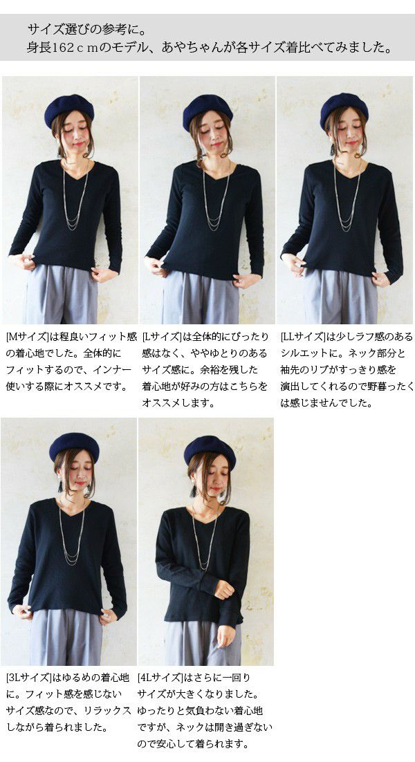 [M・L]を着用しました。[M]は程良いフィット感でした。[L]だと全体的にぴったりしすぎる事なくややゆとりがありました。着丈は[L]でお尻の3分の1くらいが隠れる長さでした。袖は手の甲が半分隠れるくらい。これからの季節はジャケットやブルゾンなど羽織物のインナーとしてもおすすめ!Vネックが顔周りをスッキリ見せてくれるので、重たい印象にならないのが◎