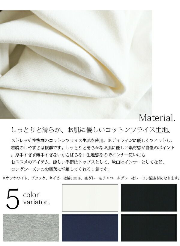 (オフホワイト、ネイビー、ブラック)綿100%(杢グレー)綿90%レーヨン10%(チャコールグレー)綿60%レーヨン40%
