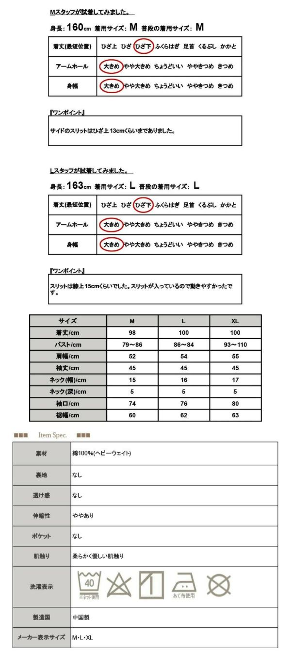 このワンピースは、綿100%のヘビーウェイトコットンを使用しており、肌触りが良く、耐久性に優れています。サイドスリットが施されているため、動きやすさも抜群です。ゆったりとしたデザインで、春から夏にかけて快適に着用できます。カラーバリエーションも豊富で、ブラック、杢グレー、オートミール、ネイビー、マスタード、カーキ、ダークピンク、ブラウン、ブルー、ベージュの10色からお選びいただけます。サイズもM、L、XLと幅広く展開しており、さまざまな体型の方にフィットします。お財布にやさしい価格設定で、日常使いに最適な一着です。
