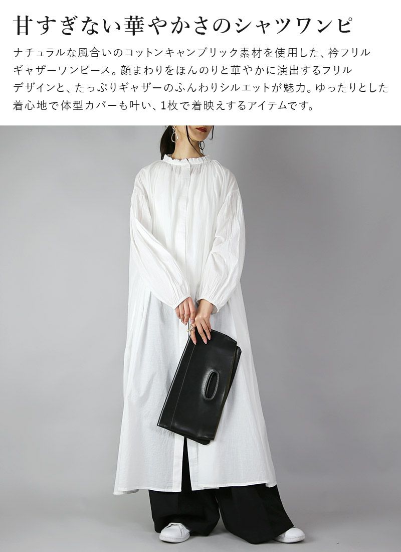 他の画像を見る ふんわりシルエットで魅せる。程よい華やかさで甘くなりすぎずナチュラルな印象に◎ キャンブリック衿フリルギャザーワンピース M-L 【メール便対応不可】 販売価格 ¥ 5,799 税込 カートに入れる お気に入りに登録する