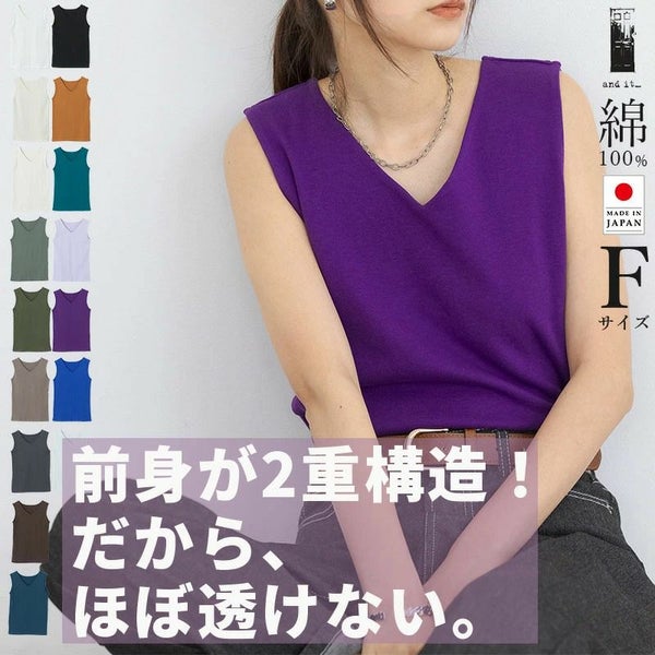 トップス インナー タンクトップ Vネック 首元すっきり すっきり 前身頃 二枚仕立て 二重構造 厚手 透けない 透けにくい 日本製 made in japan メイドインジャパン 安心 コットン 綿 100% デイリー 普段使い シンプル 無地 使いやすい 着回し 重ね着 ロングシーズン シーズンレス 春 夏 秋 冬 F Fサイズ フリー フリーサイズ カラー豊富 カラー展開豊富 16カラー 16色 オフホワイト クリーム ベージュ くすみカーキ カーキグリーン くすみブラウン コイチャコール チョコ くすみブルー ブラック キャメル インクブルー ラベンダー パープル ロイヤルブルー ウスグレー 白 黒 茶 青 紫 andit_ and it_ andit ANDIT_ ANDIT あんどいっと アンドイット ゆったり SS スプリング サマー ママ服 カジュアル 大人 トレンド レイヤード 大人女子 大人可愛い きれいめ シンプル ゆる レディース ファッション レディースファッション 20 30 40 50 20代 30代 40代 50代
