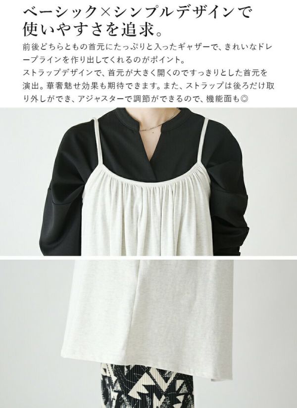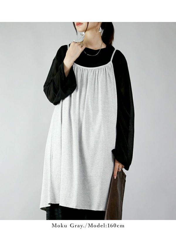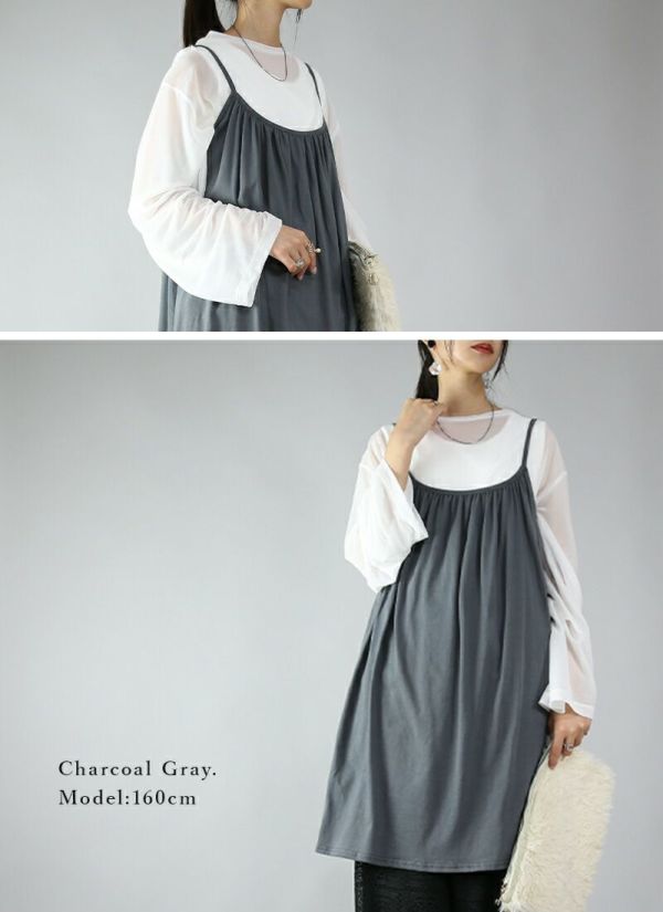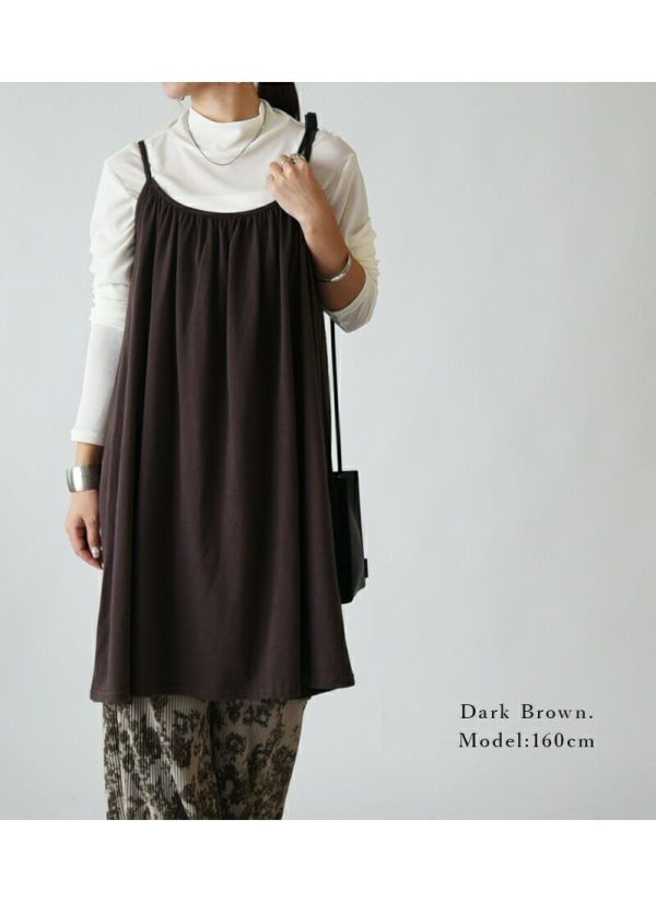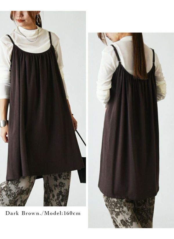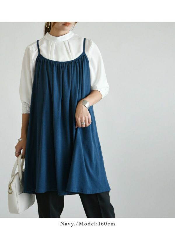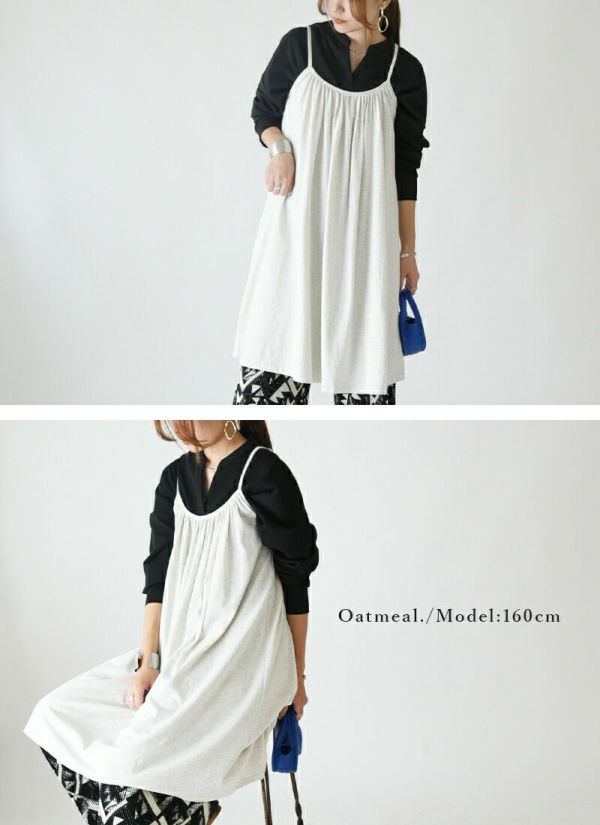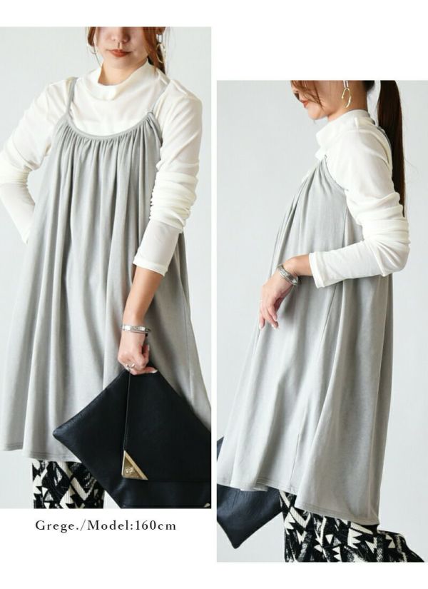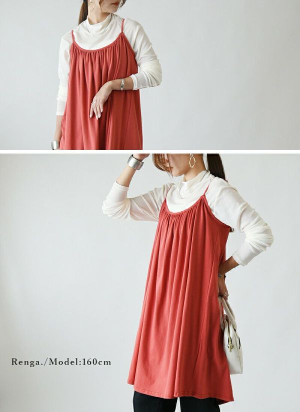 私が着ると、ひざが隠れるぐらいの長さでした。ストラップはアジャスターで調節可能なので自分好みの着丈にアレンジ出来るのが嬉しいですよね。首元からギャザーがたっぷりと入っているので裾に向かってキレイなドレープラインが入るのが可愛いなって思いました★