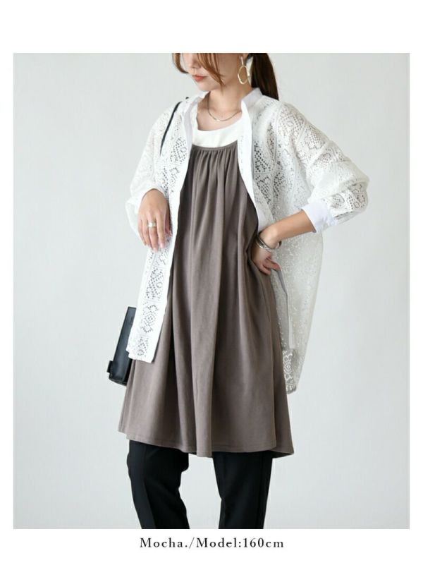ストラップ部分を最長まで伸ばして、着丈はひざ上8cmぐらいの長さになりました。ストラップで着丈の長さが調整可能なのが嬉しいポイントですね。飾り気のないシンプルなデザインだから毎日の着こなしの定番として活躍してくれそう♪個人的にはスキニーパンツと合わせてシンプルな大人可愛い着こなしを楽しみたいですね。