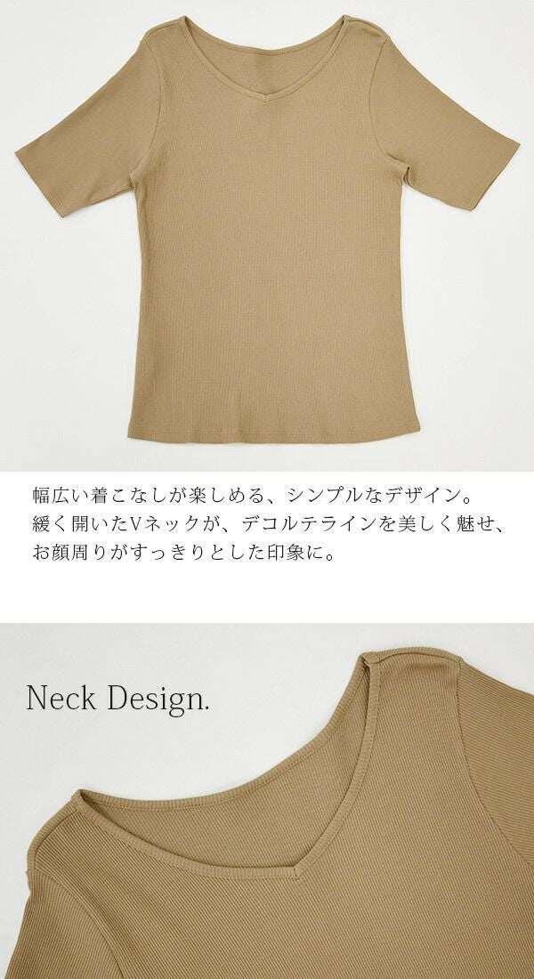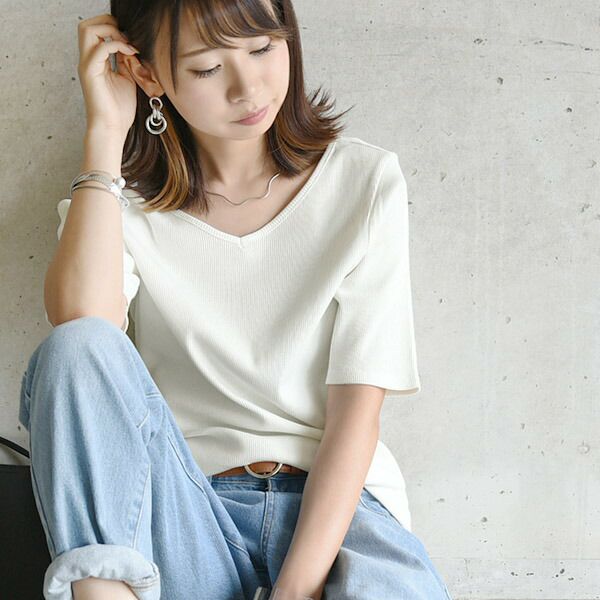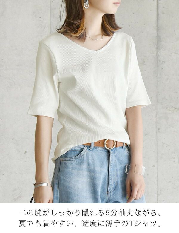 デコルテラインを美しく魅せるVネックで、スッキリ見せな着こなしに◎ Vネック デイリー使い ナチュラル 【受注発注】Vネック5分袖コットンリブTシャツ 【メール便対応可】
