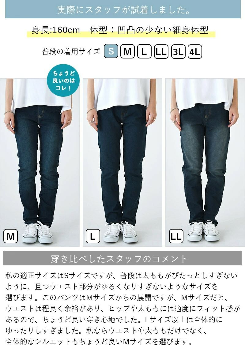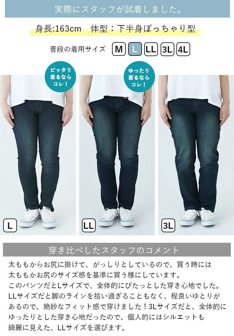 他の画像を見る 程良く厚みのあるデニムで、フィットするのに脚のラインを拾わない!すっきりきれい魅せを叶える、デニムパンツ◎ フィットデニムパンツ M L LL 3L 4L 【メール便対応可】 販売価格 ¥ 3,999 税込 カートに入れる お気に入りに登録する