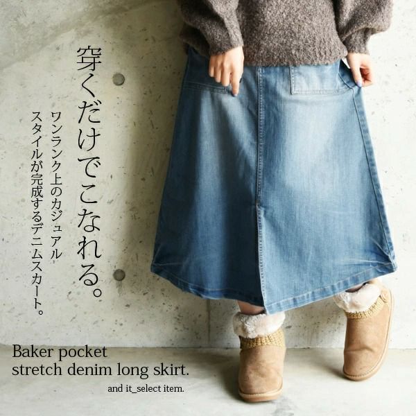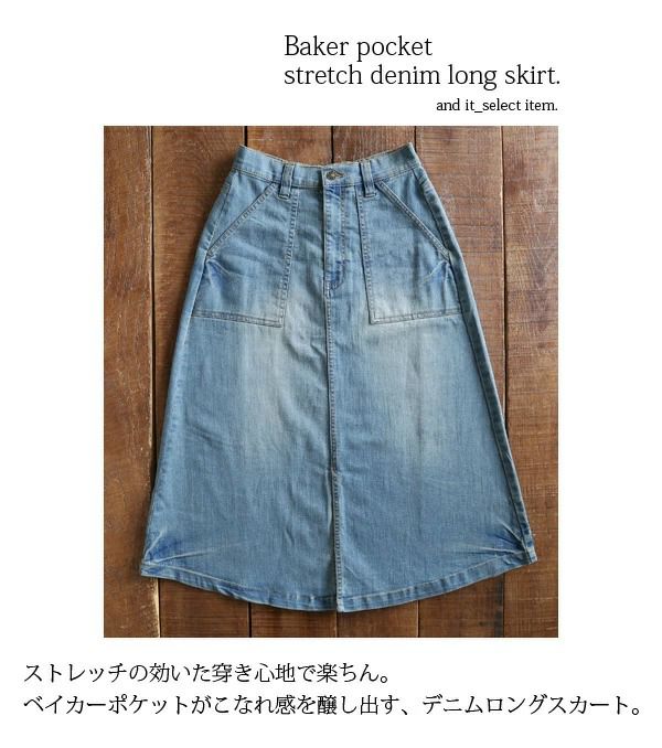 ベイカーポケットストレッチデニムロングスカート 【メール便対応不可】