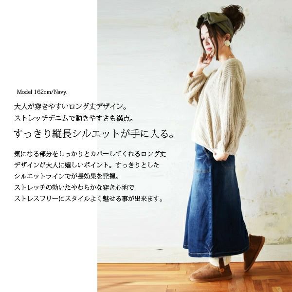 [Mサイズ]を着用。着丈はジャストウエストで穿いてくるぶしより10cm上くらいの長さでした。ウエストは程良いフィット感で穿く事が出来ました。バックゴム仕様で締め付け感のないウエストサイズが◎ストレッチが効いたデニム生地なので、ロングスカートコーデも動きやすいのが嬉しいです!程良く広がったAラインがレッグラインを美しく見せてくれます♪