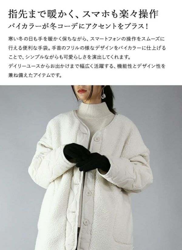 スマホ対応の便利な手袋が登場!人差し指と親指にはスマホ対応加工が施されているので、寒い日でも指先はしっかり防寒しながらスマートフォンの操作が可能です◎シンプルなデザインにバイカラーのフリルデザインが大人可愛い印象に。機能性とデザイン性を兼ね備えたアイテムです♪