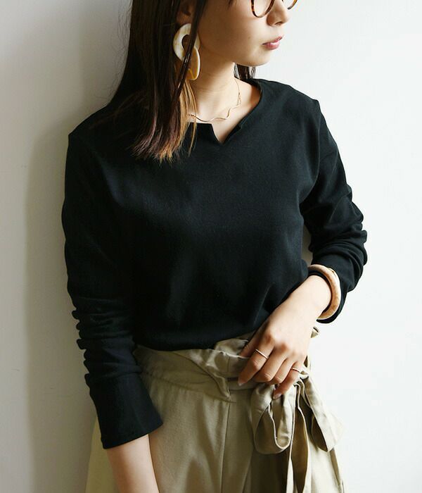まさにシンプルイズベストといった感じですが、キーネックがアクセントになっていてさりげなくおしゃれなのがいい♪ コットン100%で肌触りもよくていいです!