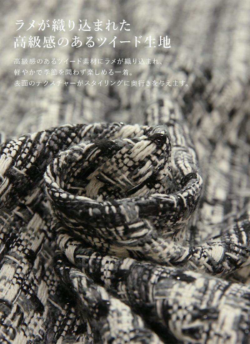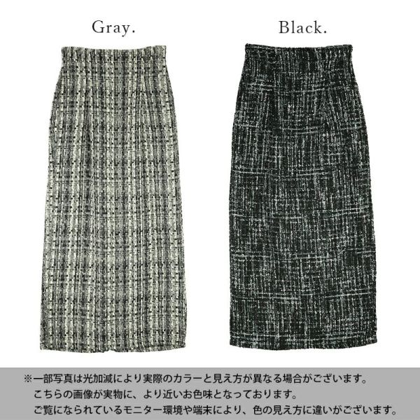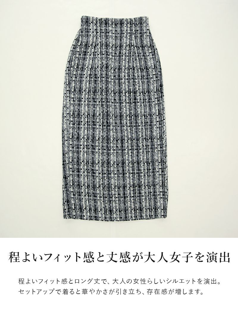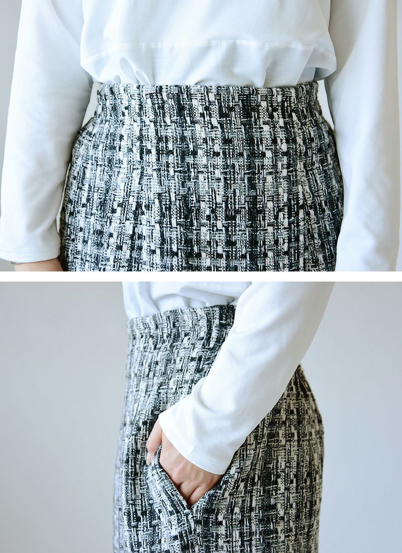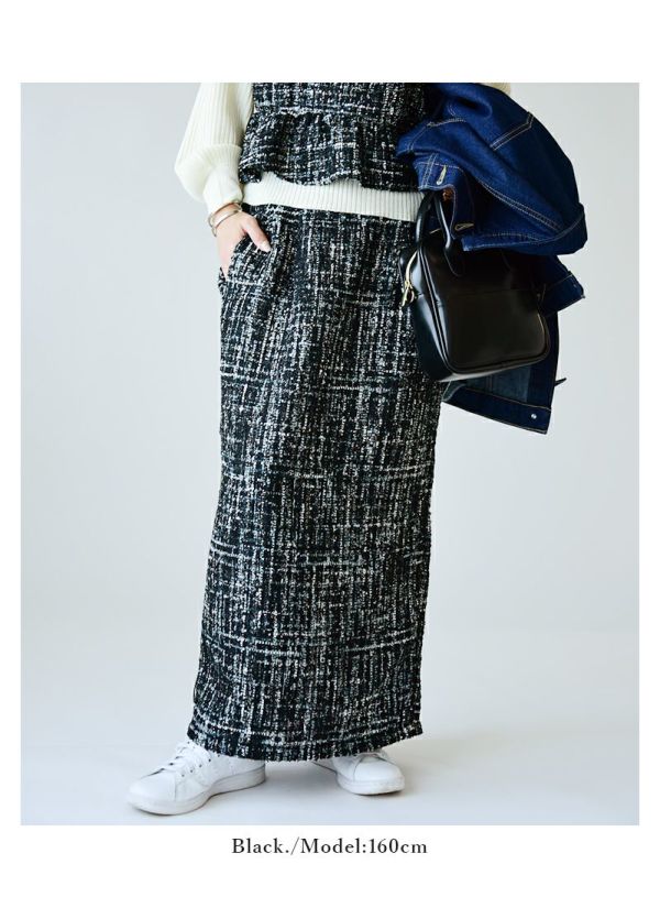 ラメ感が上品なツイード生地で大人な印象に。ラインを隠しつつ大人見えするタイトスカート♪