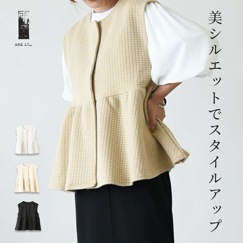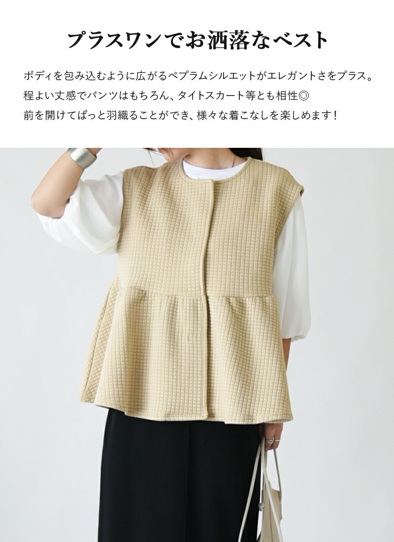 他の画像を見る キルト風の素材が可愛い!ふんわりとしたボリュームが女性らしいペプラムベスト♪ ワッフルキルトペプラムベスト M 【メール便対応不可】 販売価格 ¥ 4,699 税込 カートに入れる お気に入りに登録する