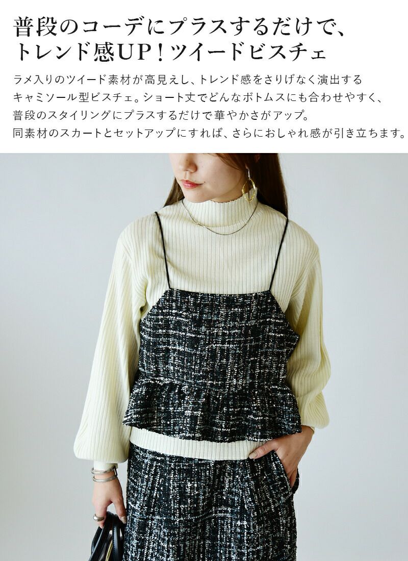 他の画像を見る 普段のスタイリングにプラスするだけ!ラメ感が上品な高見えビスチェ。 ミックスツイードビスチェキャミソール M 【メール便対応可】 販売価格 ¥ 3,599 税込 カートに入れる お気に入りに登録する