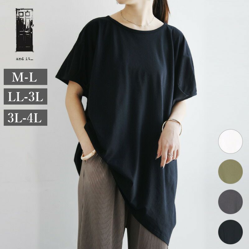 左右非対称なヘムデザインでこなれたスタイリングに!ゆったりシルエットでラフな着心地! 綿100% コットン ゆったり アシメシルエットコットンロングカットソー M L LL 3L 4L 5L 【メール便対応可】