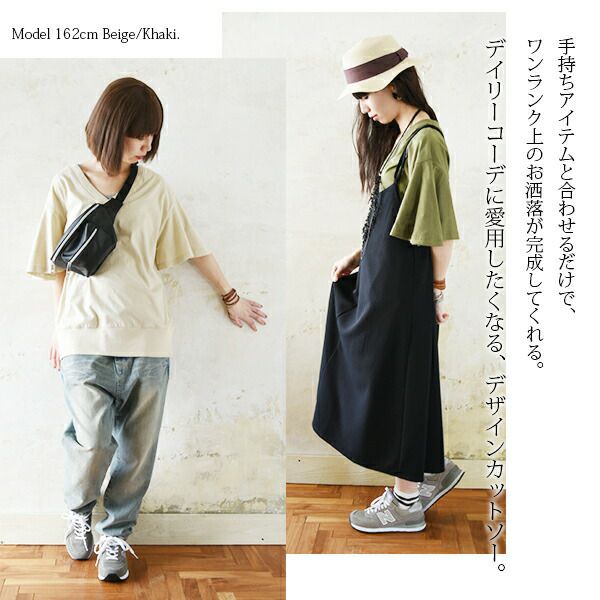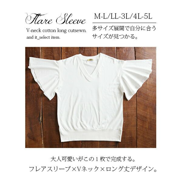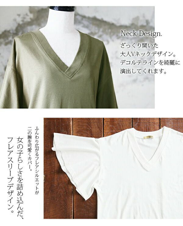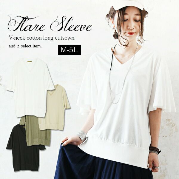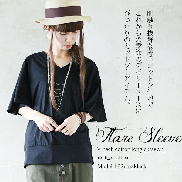 袖フレアVネックコットンロングカットソー 【メール便対応可】