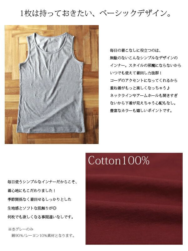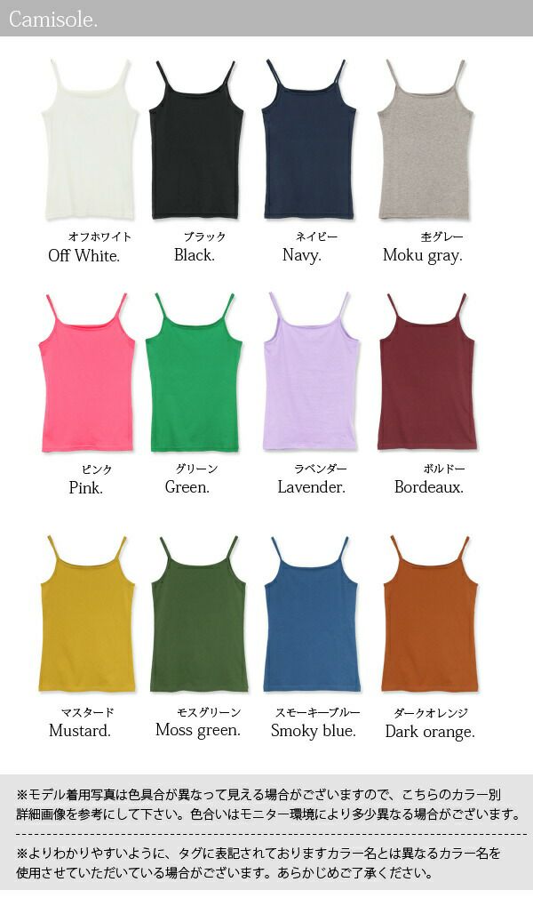 他の画像を見る 何着あっても困らない、年中使える定番インナー!豊富なカラバリ&プチプラだからまとめ買いにもおすすめです♪9色・M~LLの3サイズ展開です! カラーコットンベーシックタンクトップ&キャミソール 【メール便対応可】 販売価格 ¥ 1,399 税込 カートに入れる お気に入りに登録する